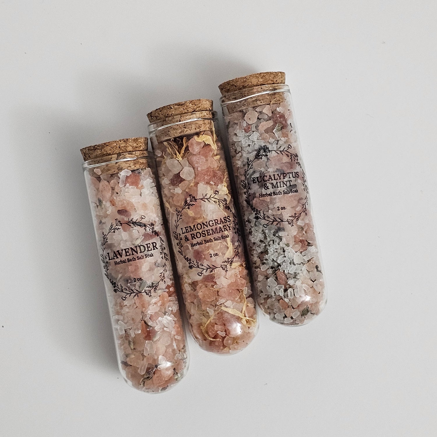 Our handcrafted Herbal Bath Salt Soak showcases the renowned healing properties of Epsom and Pink Himalayan Salts, known for their skin-softening benefits and are infused with organic essential oils and therapeutic herbs.